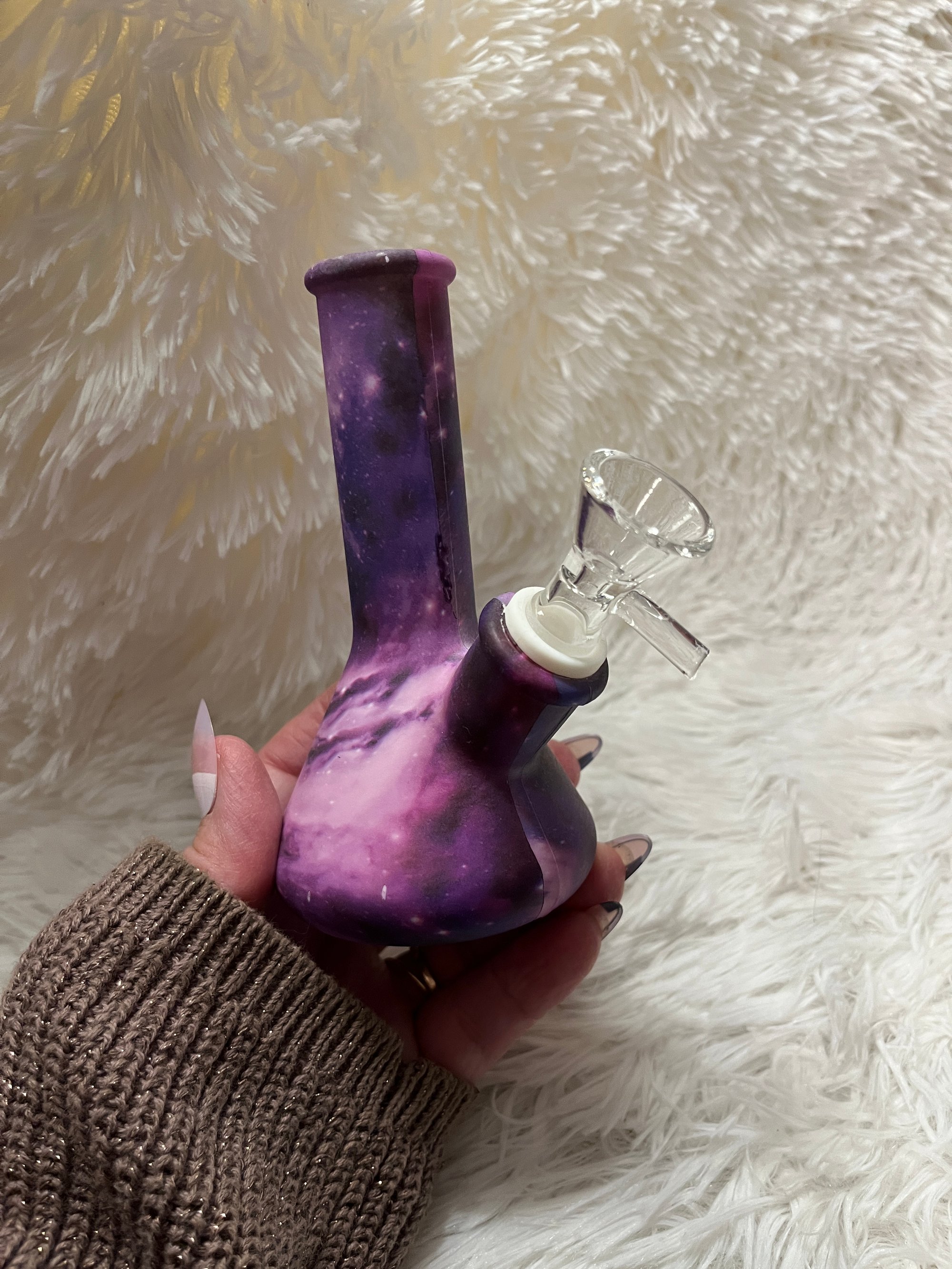 Introducing Our Mini Purple Galaxy Silicone Bong, which is A Celestial Beauty With Great functionality. This Cute Compact Bong is Designed To Deliver Smooth and Flavorful Hits While Capturing The Imagination